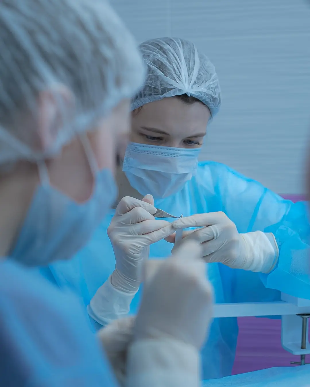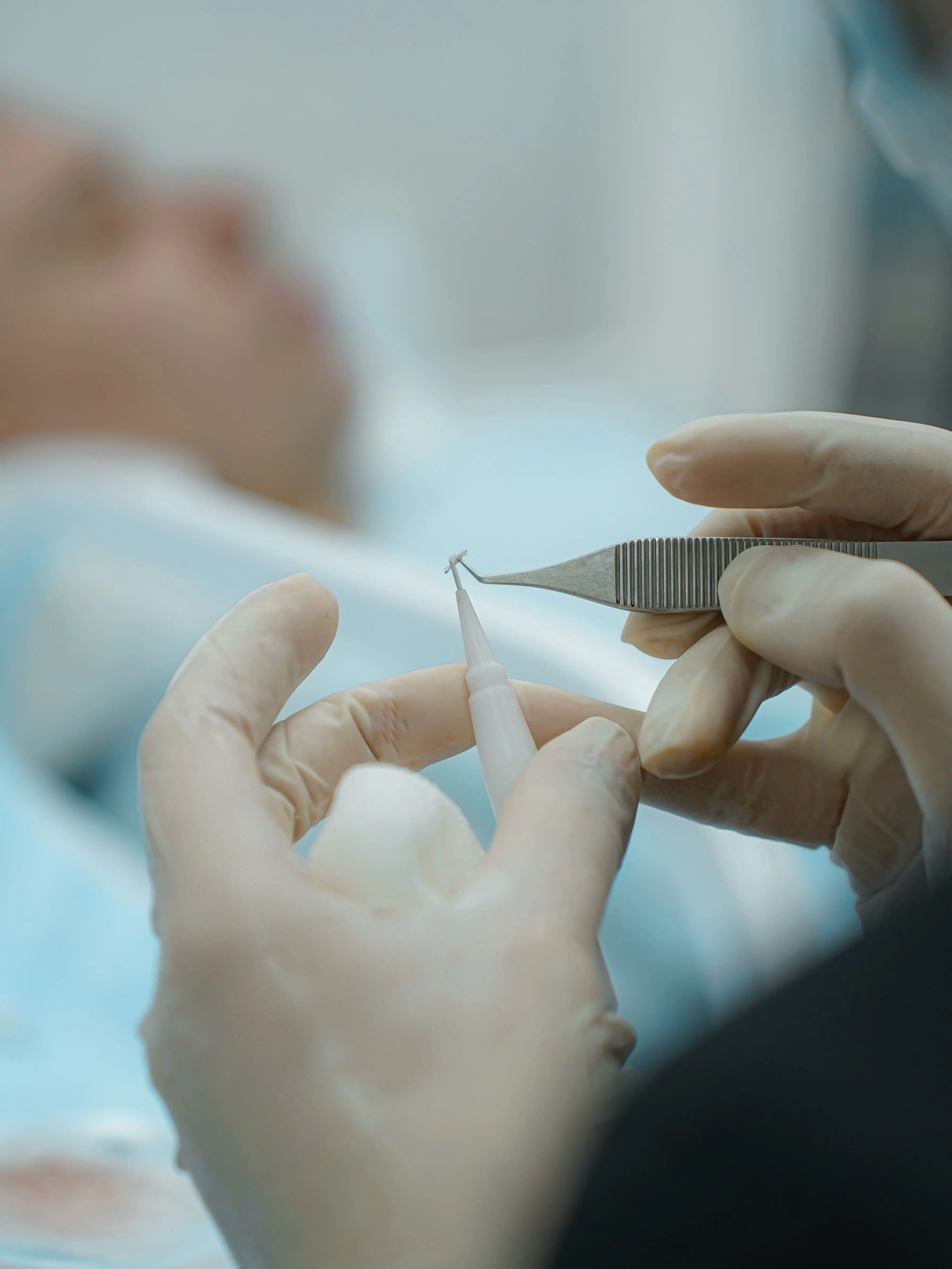 Врач-трансплантолог имплантирует каждый графт в зону бороды, точно соблюдая направление естественного роста волос и необходимую плотность посадки для достижения естественного результата