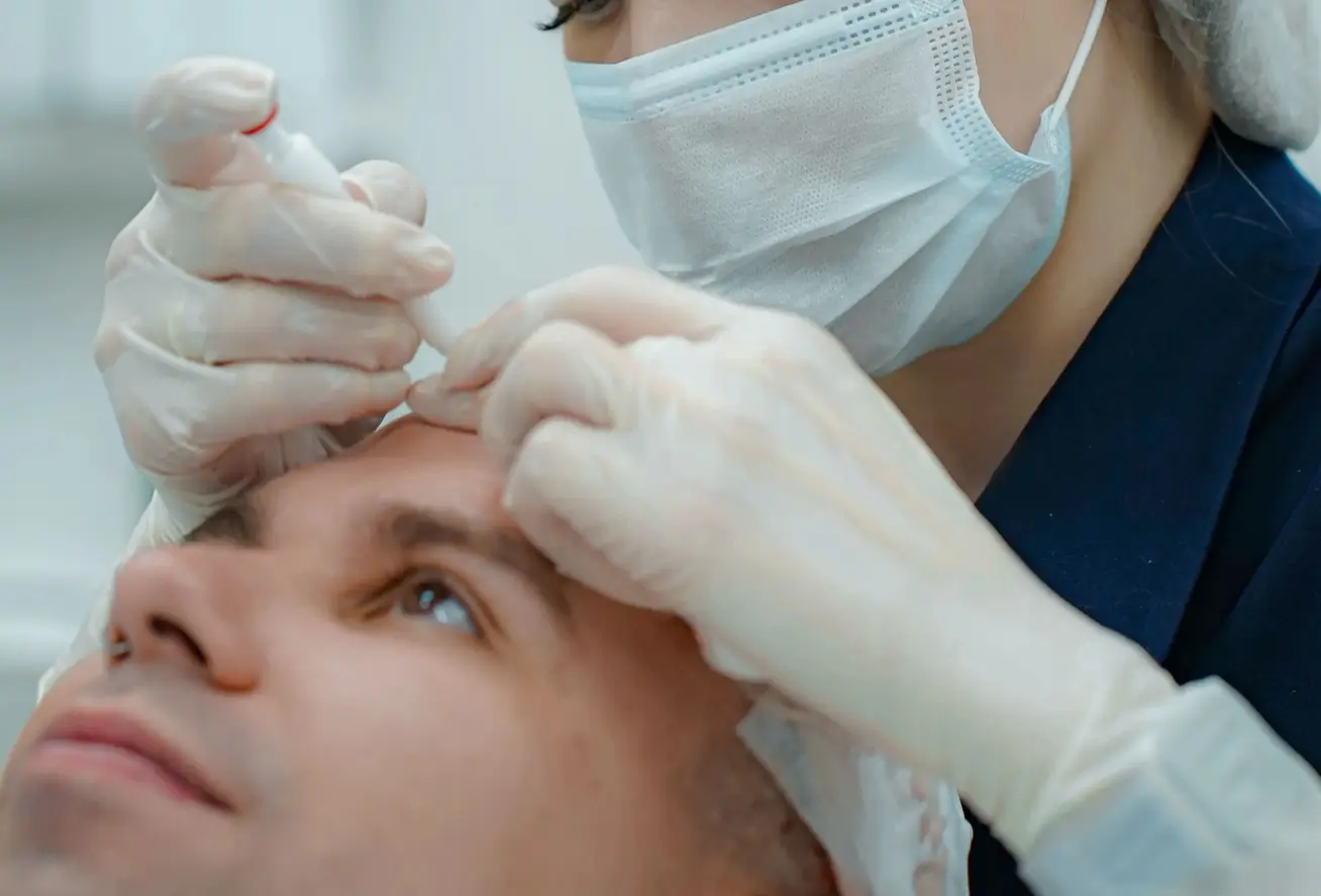 Врач демонстрирует пациенту результат процедуры пересадки волос. На обработанную зону накладывается антисептическая повязка. Пациент получает подробные инструкции по послеоперационному уходу и дату следующего визита